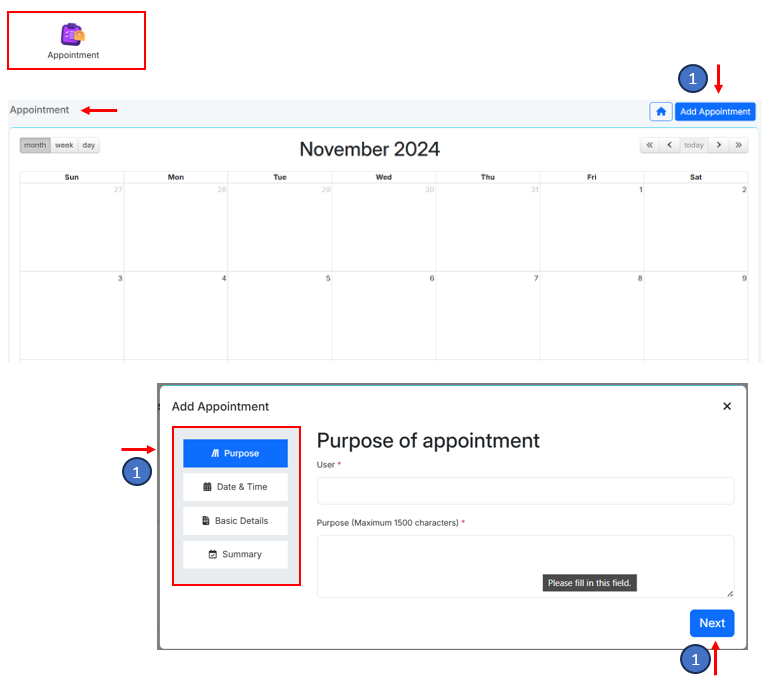 - Propósito: Ingresa el nombre del usuario y la razón de la cita.