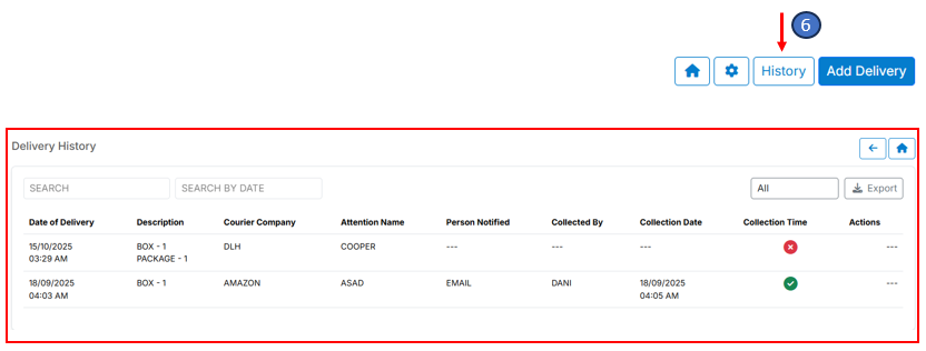 - Los usuarios tienen la opción de exportar este historial para imprimir usando la característica "Exportar". Adicionalmente, pueden emplear varios filtros de búsqueda para refinar resultados y encontrar el registro más relevante.