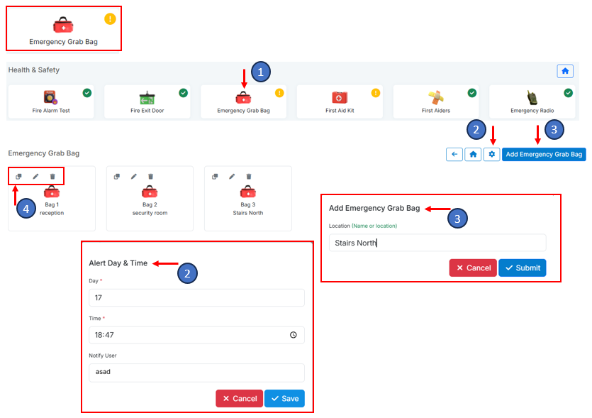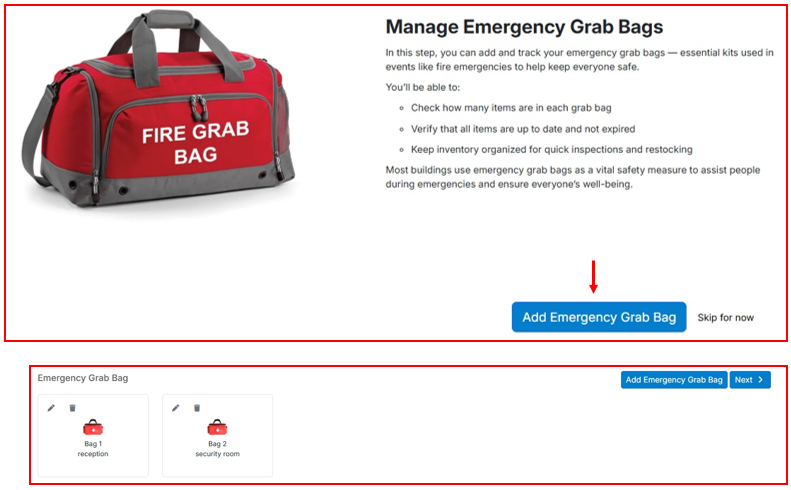- Todos los registros de ubicaciones de Mochilas de Emergencia dentro del edificio se mostrarán en esta ventana.