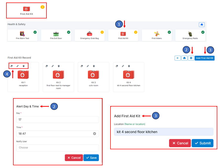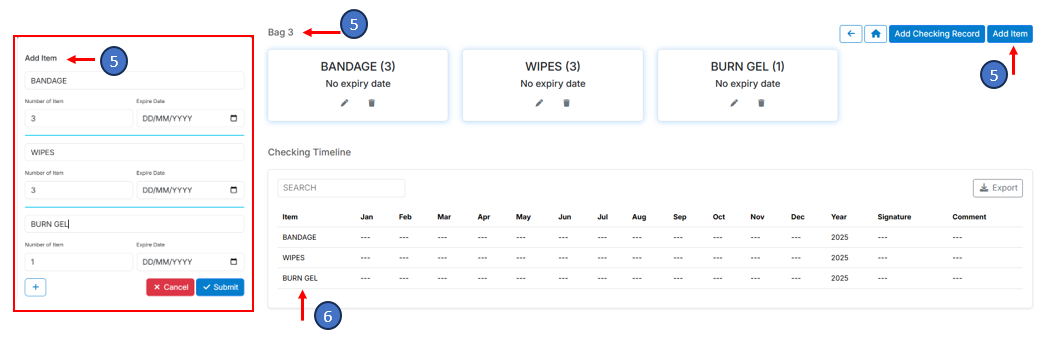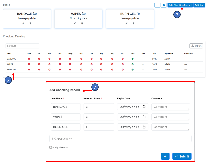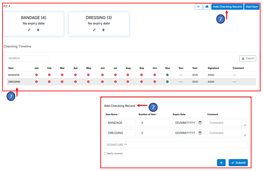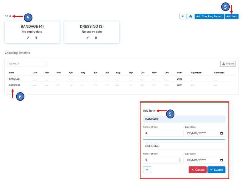 Por el contrario, la presencia de la "señal amarilla" sugiere que ciertos artículos dentro del botiquín aún deben someterse al proceso de verificación. - Iniciar un nuevo registro para un botiquín de primeros auxilios es fácil. Haz clic en el botón "Agregar Botiquín de Primeros Auxilios", procede a completar el formulario diligentemente y, al finalizar, haz clic en "Enviar". Esta acción agrega sin problemas un nuevo registro al repositorio.