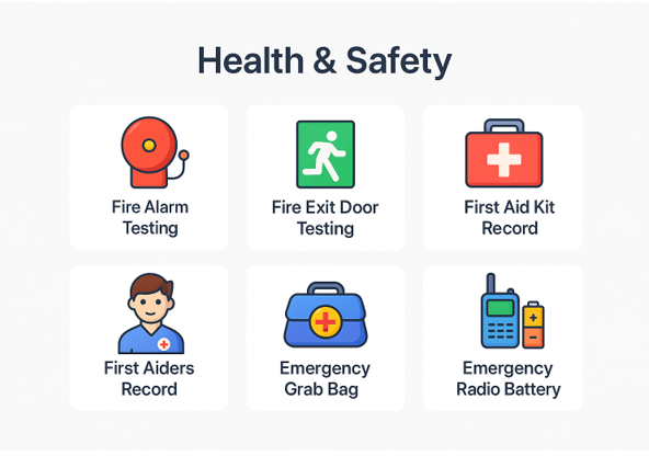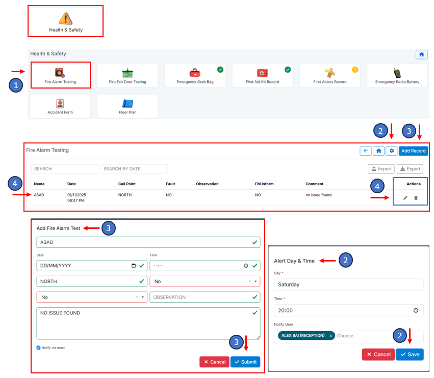 - Para acceder a los registros de Prueba de Alarma de Incendio, navega al botón "Prueba de Alarma de Incendio" dentro de la sección "Salud y Seguridad". Esta acción abrirá una nueva ventana mostrando los registros existentes de Prueba de Alarma de Incendio.