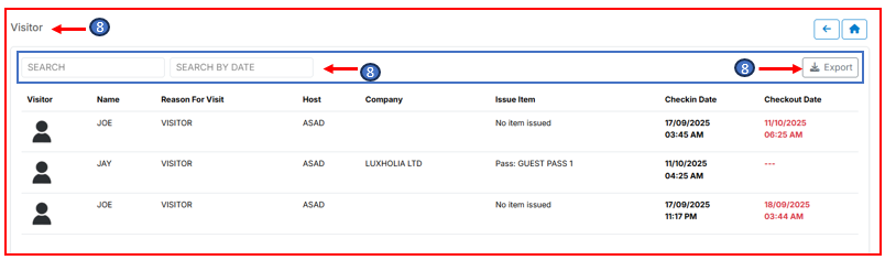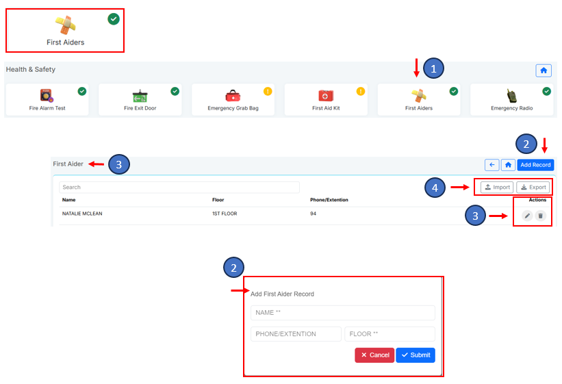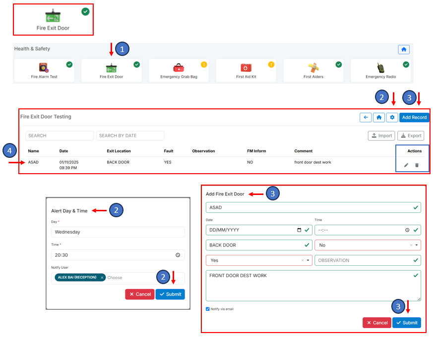 - Utiliza el botón Exportar para guardar y descargar los registros de "Puerta de Salida de Emergencia" en un archivo Excel para imprimir. La opción Importar permite a los usuarios cargar registros desde sus escritorios.