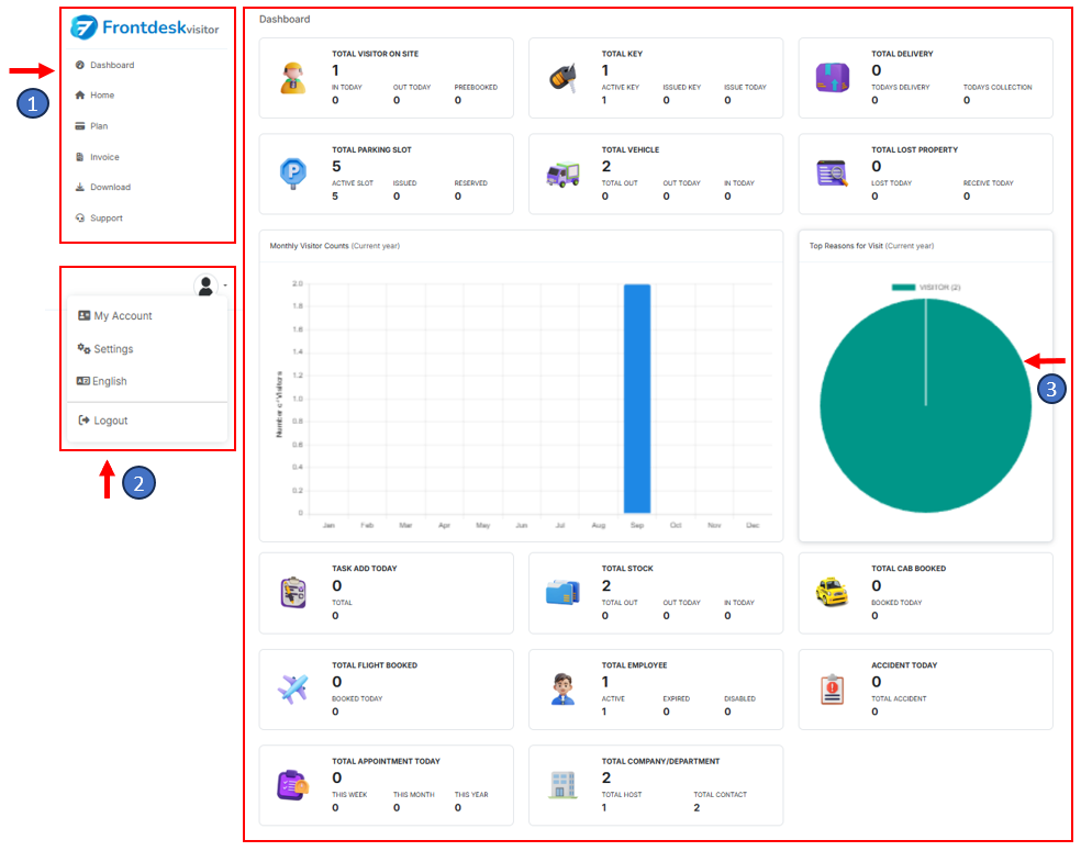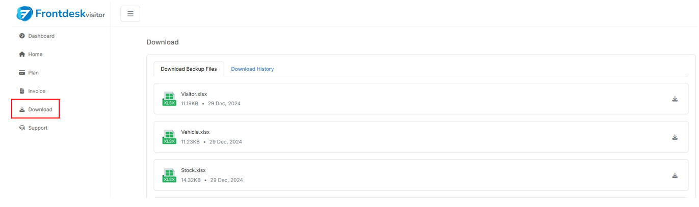 - Muestra una lista de archivos descargables relacionados con visitantes, vehículos, inventario, reservas de taxi y entregas, etc.