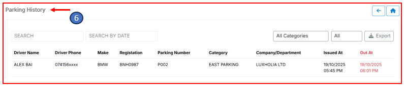- Para ver el historial de salida del vehículo, simplemente haz clic en el botón "Historial". Esta acción activa la apertura de una nueva ventana, revelando el historial completo del vehículo.