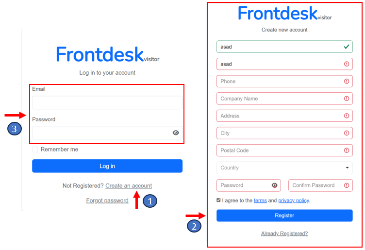 - Para registrarte y crear una cuenta, visita www.frontdeskvisitor.com y haz clic en "Crear una cuenta".