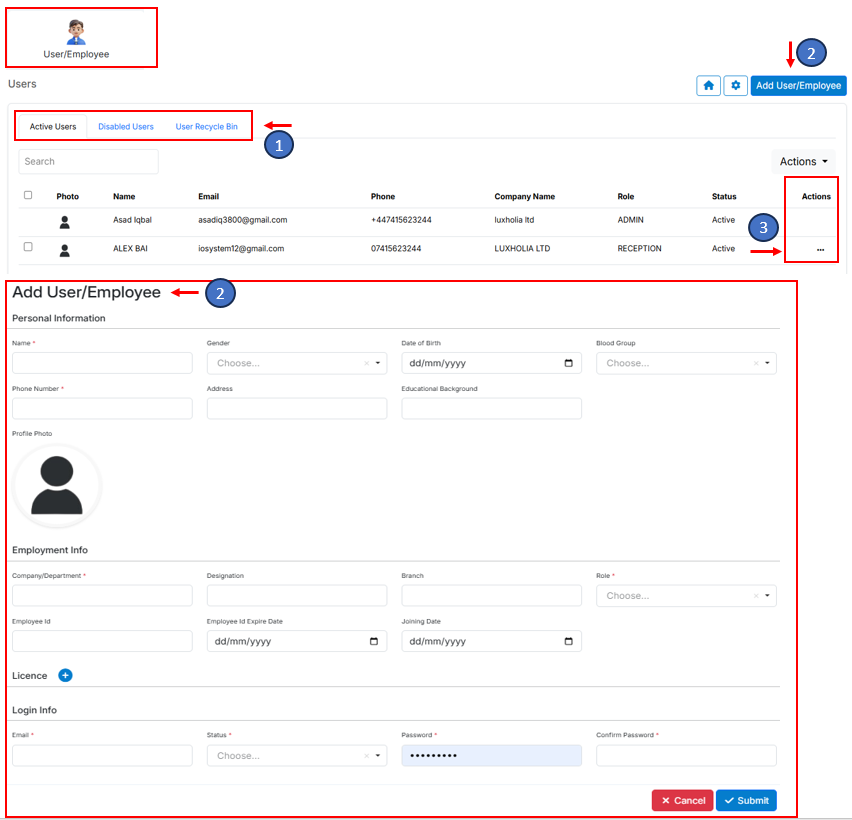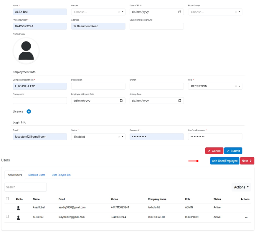 - Haz clic en "Agregar Usuario/Empleado" para abrir el formulario de creación de usuario.