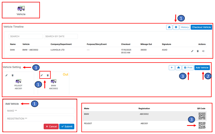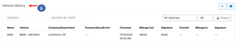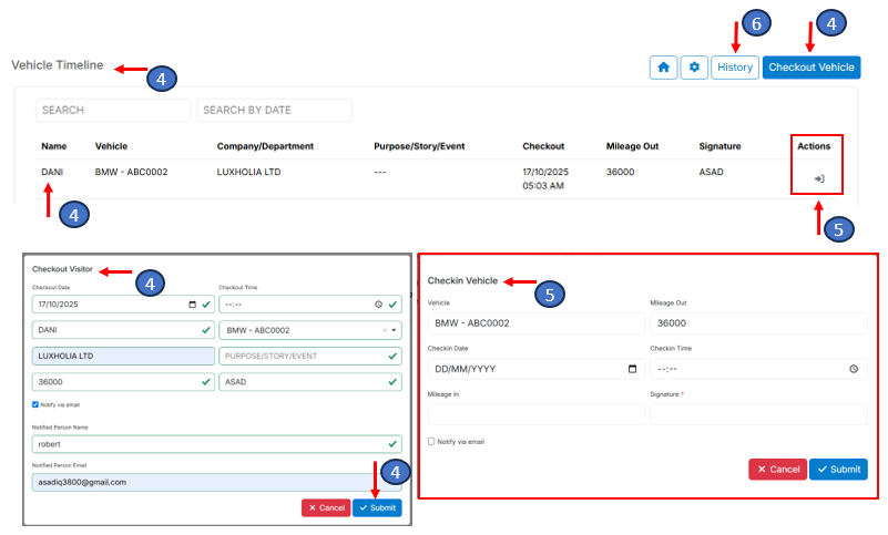 Para completar un registro de salida de vehículo, se solicita a los usuarios que seleccionen el botón "Registro de Salida del Vehículo". Los usuarios ingresarán todos los detalles de salida necesarios dentro de la ventana emergente antes de confirmar con el botón "Enviar". Un nuevo registro de salida aparecerá en la ventana "Línea de Tiempo del Vehículo".