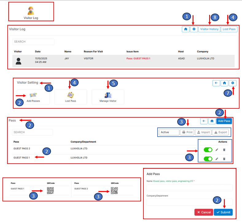 - Tipo de Pase (por ejemplo, Visitante, Invitado, Contratista, Ingeniero). Empresa/Departamento (a quién se emite el pase o con quién está asociado).