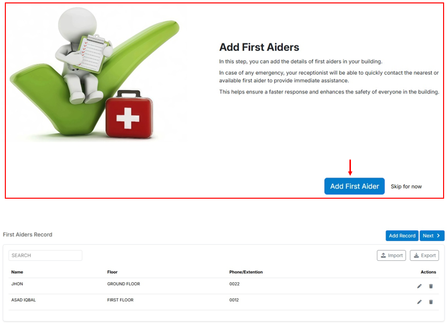 - Ve y gestiona registros de todos los socorristas registrados dentro del edificio directamente dentro de la ventana del Socorrista.