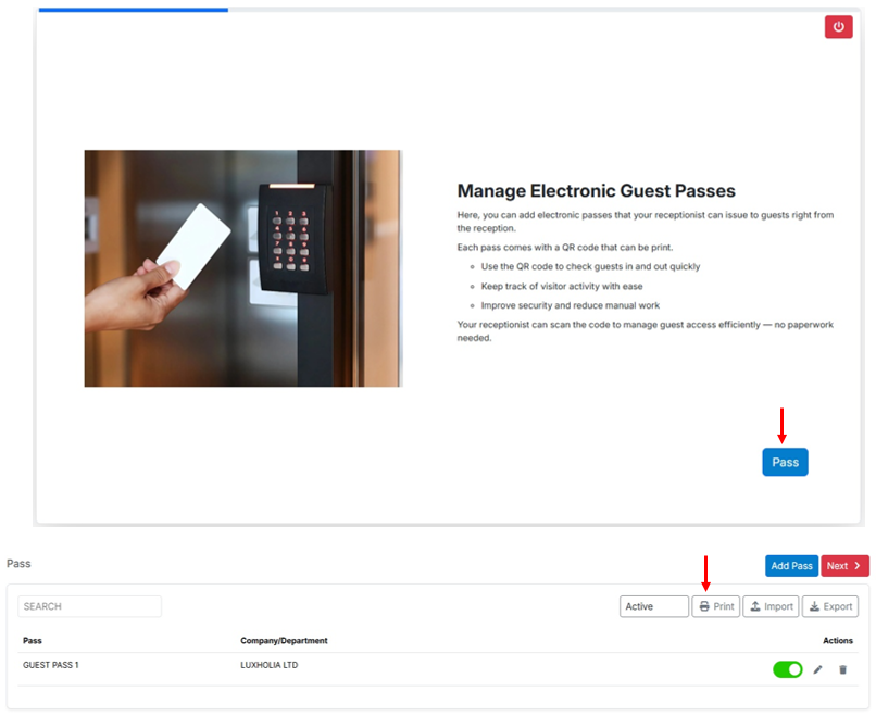 En este paso, el Administrador configura los pases que se emitirán a invitados, visitantes, contratistas o ingenieros.