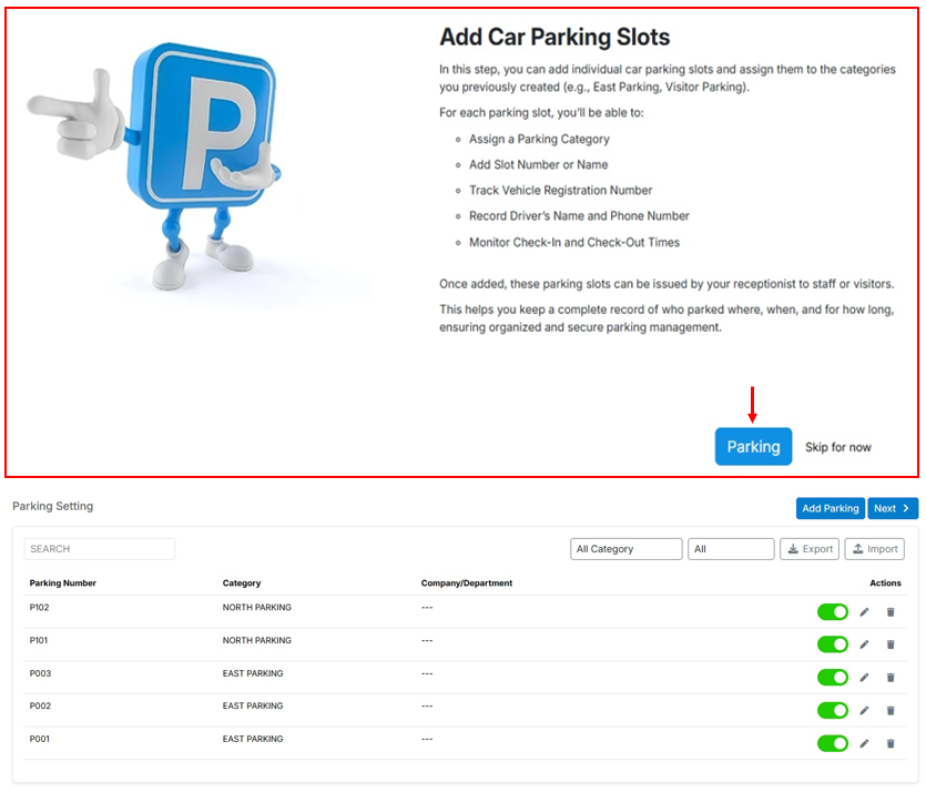 - Repite el proceso hasta que todos los espacios de estacionamiento se agreguen al sistema.